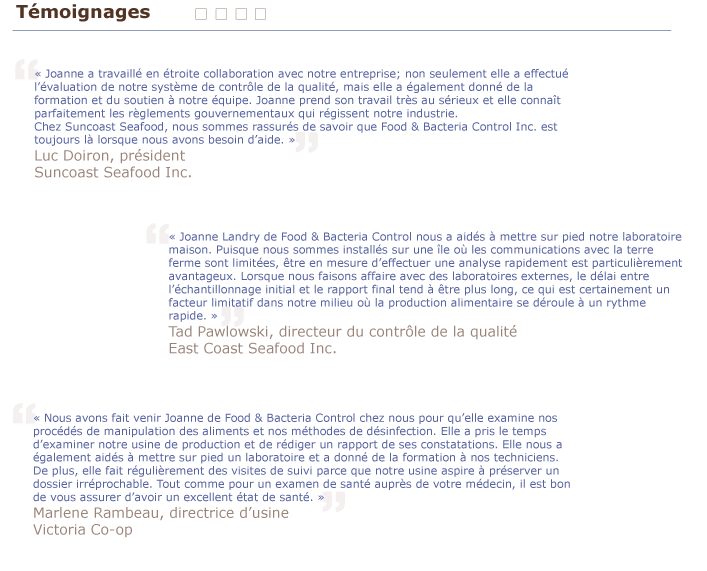 Food & Bacteria Control Inc. peut vous aider. Nous faisons des affaires dans le domaine du contrôle de la qualité des aliments depuis 2006 et nous avons à notre actif plus de 20 ans d’expérience en matière de salubrité des aliments. Situé près de Moncton, au Nouveau-Brunswick, au Canada, Food & Bacteria Control peut contribuer à faire en sorte que les aliments que vous préparez, fabriquez ou achetez sont conformes aux exigences réglementaires.